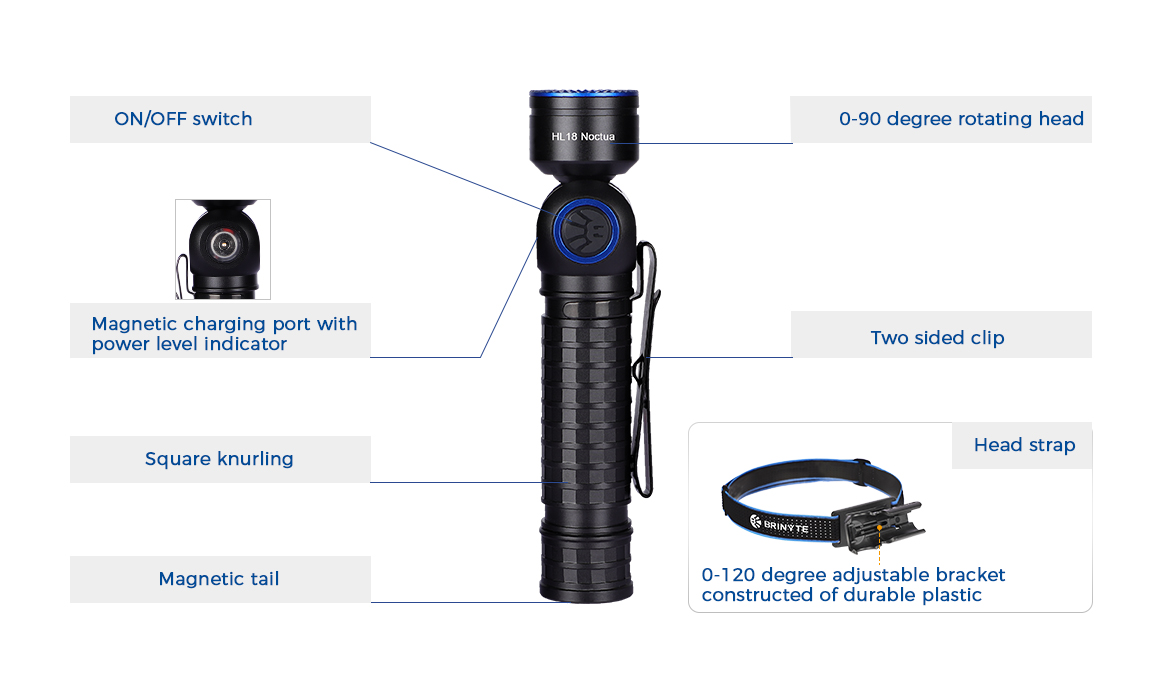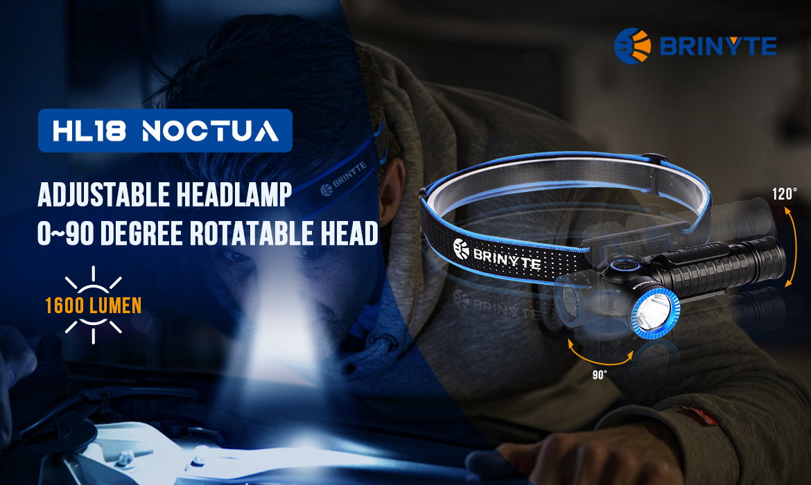 Brinyte HL18 can be used as either a headlamp or handheld light. It adopts a high-performing Luminus LED, capable of producing authentic 1600 lumens max beam and reflecting max throw up to 308m. Powered by one 18650 3100mAh battery, it runs up to 120 hours at 10 lumens. With 90 degrees rotating head, 0-120 degree adjustable bracket constructed of durable plastic, and a strong magnetic base, this small headlamp can function perfectly to meet most lighting needs. Its mesh-style headband gives you a much cooler wearing experience than other headlamps.