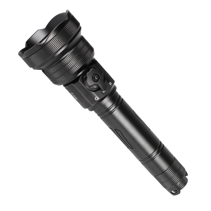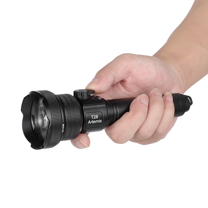 Brinyte T28 is a zoomable hunting flashlight with its own patented tri-color lighting sources control switch design. Utilize one CREE white LED, one CREE red LED and one CREE green LED, easy to meet users multi-lighting sources requirements. Unique tail stepless dimmer switch design, it is very convenient to adjust any brightness you need. T28 Artemis will be an excellent light choice for hunting and other outdoor activities. There is another version of T28 Artemis available, named T28-IR Artemis, only LEDs color different.