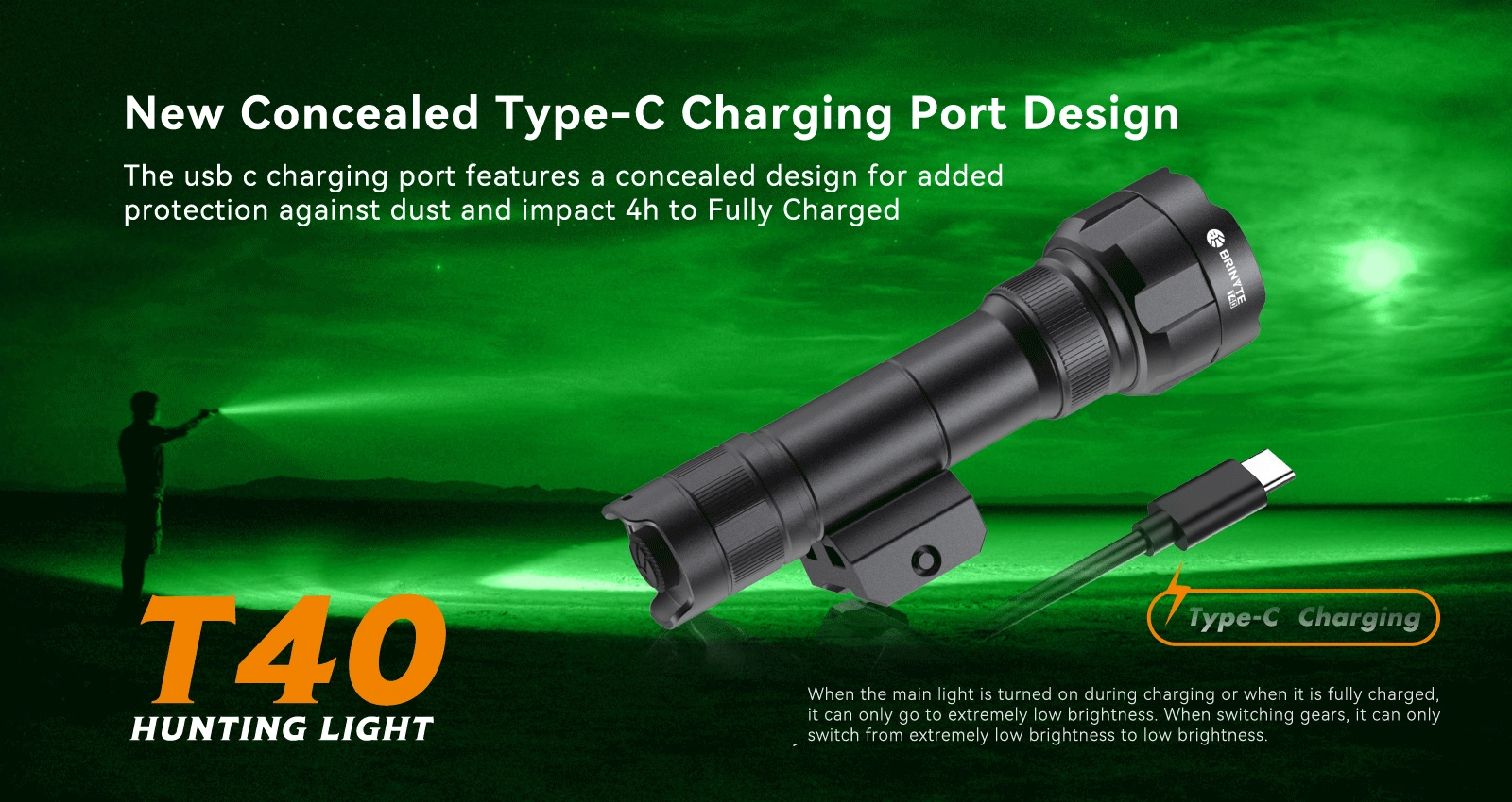 The Brinyte T40 is a USB-C rechargeable multifunctional flashlight specially designed for night hunting. With powerful brightness, adjustable modes, and reliable long-distance illumination, it helps hunters track and spot targets with confidence in low-light environments. Beyond hunting, the T40 is also an excellent choice for camping, fishing, emergency repairs, and everyday backup lighting, making it a versatile companion for both outdoor and daily use.